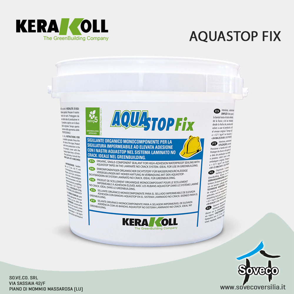 Aquastop Fix sviluppa un’eleva adesione impermeabile degli accessori Aquastop sulla membrana Aquastop Green per garantire la tenuta idraulica del sistema in tempi brevissimi e la durabilità dell’applicazione agli attacchi basici grazie alle alte resistenze chimiche.